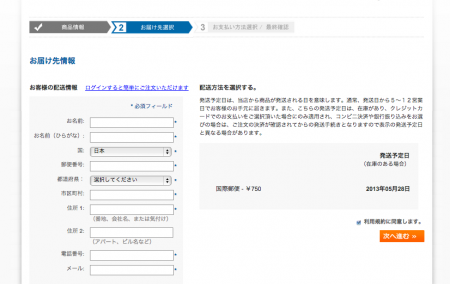 3.お届け先を選択し、「利用規約に同意します」のチェックボックスにチェックを入れたら「次へ進む」をクリックしてください。