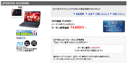 富士通のネットショップ「WEB MART」で、販売している”未使用・未開封”のアウトレットPCが今週末限定で、クーポンを使うと5,000円引きになります!
