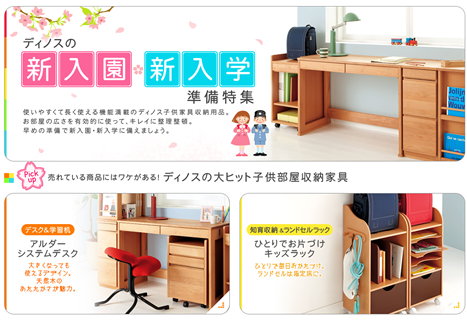現在、子供向けに「新入園&新入学準備特集」も実施されていて、国内生産のデスク&学習机や布団の上げ下ろしがしやすい二段ベッドなどが紹介されていて、お部屋の広さを有効に・そして手間がかからず・整理整頓しやすいデザインになっています。