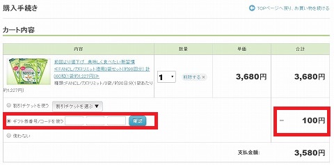 合計金額1,000円以上のお好きなクーポンを購入時に、コードを入力すると100円の割引を受けることができます。1回のご購入手続きに1つのギフトコードがご利用でき、他の割引チケットとの併用は不可となっています。