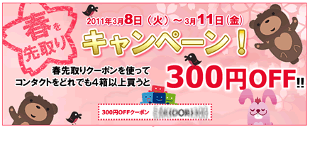 気になる内容は、3月8日から3月11日までの期間限定で、コンタクトレンズをどれでも4箱以上購入すると使用できるクーポンで、総額から300円割引となります。