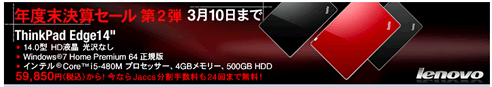 このLENOVOのホームページでは現在、年度末決算セール第2弾として、様々なPCをキャンペーン価格で販売中。その中でも注目なのが、ThinkPad SL510 ホームOS限定 デュアルコアプロセッサー、ワイヤレスLAN搭載ベーシックパッケージ、定価131.880円のお品が、今なら47.880円というから驚愕です。