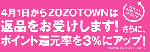 この度、zozotownでは、4月1日より、「返品受付スタート&ポイント還元率アップ」を開始しました。通販で、ファッションアイテムを購入する際に皆さんが懸念する事。それは、「サイズが合わなかったら?」「デザインや色が、イメージと異なるものであったら?」という事でしょう。このような事を心配して、「通販に手を出せないんです。」という人も、多いと思いますが、返品受付がスタートしましたからこれからは安心ですね。