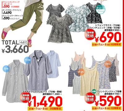 例えば、花柄プリントが女性らしいやわらかいデザインのシフォンブラウスは、通常990円が660円。シャツと合わせてきれいめに見えるライトウェイトVネックカーディガンも通常990円が790円など、他にもTシャツやポロシャツ、パンツなどが超お買い得です!