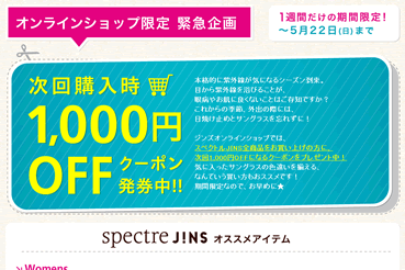 高機能、高品質なメガネを市場最低、最適価格でという「JINS」。安かろう悪かろうではなく、安くても良いメガネやサングラスをと考える昨今の流れに敏感に反応し、顧客から支持を得ています。今回のクーポンは、ジンズオンラインショップで、スペクトルJINS全商品をお買い上げの方に、次回1,000円OFFになるクーポンをプレゼントというものです。期間限定の企画なので、今年の夏用のサングラス購入を検討している方は、急いで!
