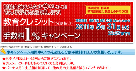 しかも、このキャンペーンは、教育クレジット手数料1%キャンペーンも対象となっています。この教育クレジットというのは、クレジットカードを持っていなくても分割払いができるサービスですが、通常は約2%~約19%と期間や支払い回数に応じて、ちょっと高めに分割手数料を支払う必要があるのですが、これをLECが負担してくれるので、一律1%となるキャンペーンです。