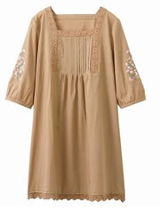 「刺しゅう使いチュニック」です。ナチュラルな雰囲気たっぷりのチュニックに、花柄の刺しゅうをあしらった、シンプルかつ可愛いデザイン。どんなボトムスにも合わせやすい色もGOODです。サイズも7Lまで展開しています。
