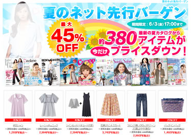 夏服を買いたいなら、セシールがオススメ!今、「夏のネット先行バーゲン」を開催中なのです。約380アイテムが最大45%OFFなのです。それも、最新の夏カタログ商品ですよ!