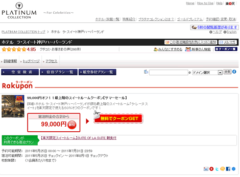 こちらのホテルの最上階のスイートルーム「ラ・レーヌ スイート」が何と!約50パーセントオフ(99000円割引)ので利用できるというクーポンです!