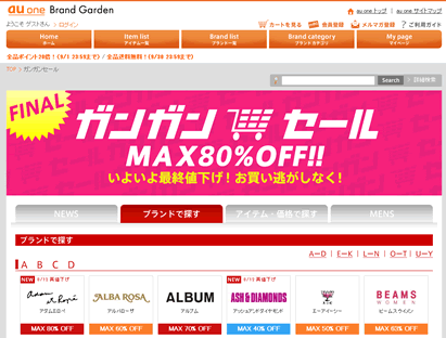 人気ブランドのLIZ LISA、UNITED ARROWS、BEAMS、JAYROなどなどがお店に行かなくても、いつでも好きな場所、好きな時間に、最新のファッションアイテムを購入出来る便利サイトです。この、au one Brand Gardenでは今、「ガンガンセール」を開催中で、最大80%OFFの最終値下げ!