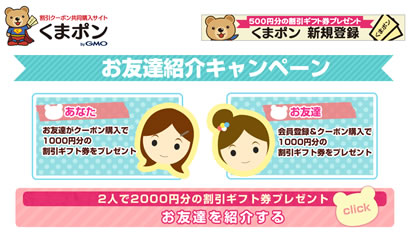 割引クーポン共同サイト「くまポン」では今、「お友達紹介キャンペーン」をやっていて、1,000円分の割引ギフト券をプレゼントされるという、とーっても嬉しいキャンペーンなので、この機会にくまポンに会員登録をして、クーポンを買ってみませんか?