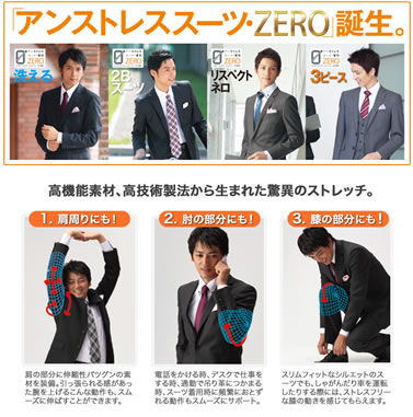 また、はるやまでは、アントレスーツ・ZEROの誕生を記念して、「アンストレススーツ特集」を組んでいます。このスーツは、『スーツの窮屈から、解放するアンストレススーツ・ZERO』として登場した、春山の自信作スーツ!サラリーマンの日常って、デスクに座ってパソコンして電話して・・・というものでは現実ありませんよね?