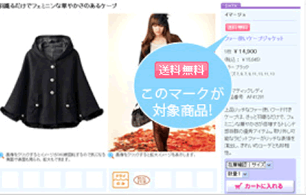 ちなみに送料無料対象商品は、ピンクの「送料無料」というアイコンが付いています。今回は、最新アイテム、SALEアイテムも一部対象となっているの♪だから、とってもお得なんです。ピンクのアイコンを目印に、お気に入りを見つけちゃいましょう。